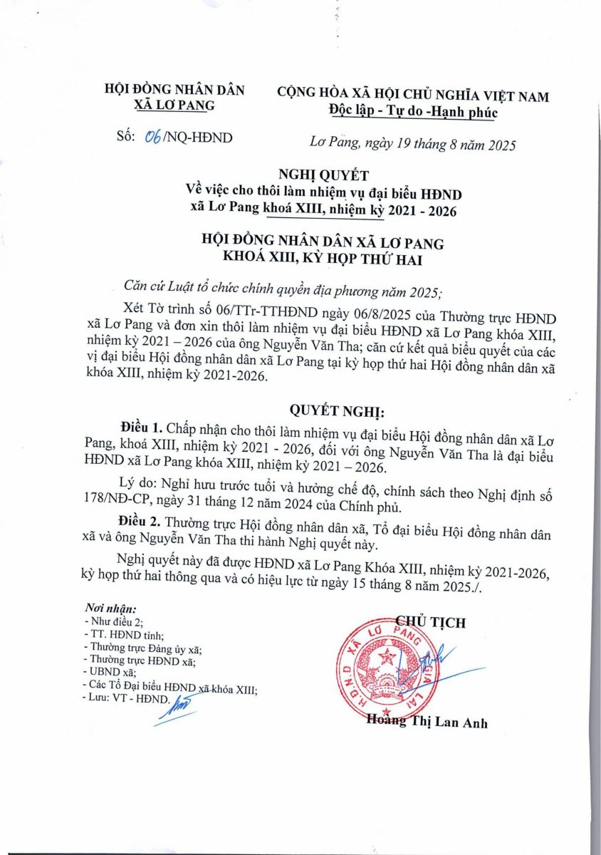 Thứ tư, 15/10/2025 | 08:18 A- A A+ | Nghị quyết số 06/NQ-HĐND ngày 19 tháng 8 năm 2025 của Hội đồng nhân dân xã Lơ Pang về việc cho thôi làm nhiệm vụ đại biểu HĐND xã Lơ Pang khóa XIII, nhiệm kỳ 2021 - 2026 Chia sẻ Đọc bài Lưu