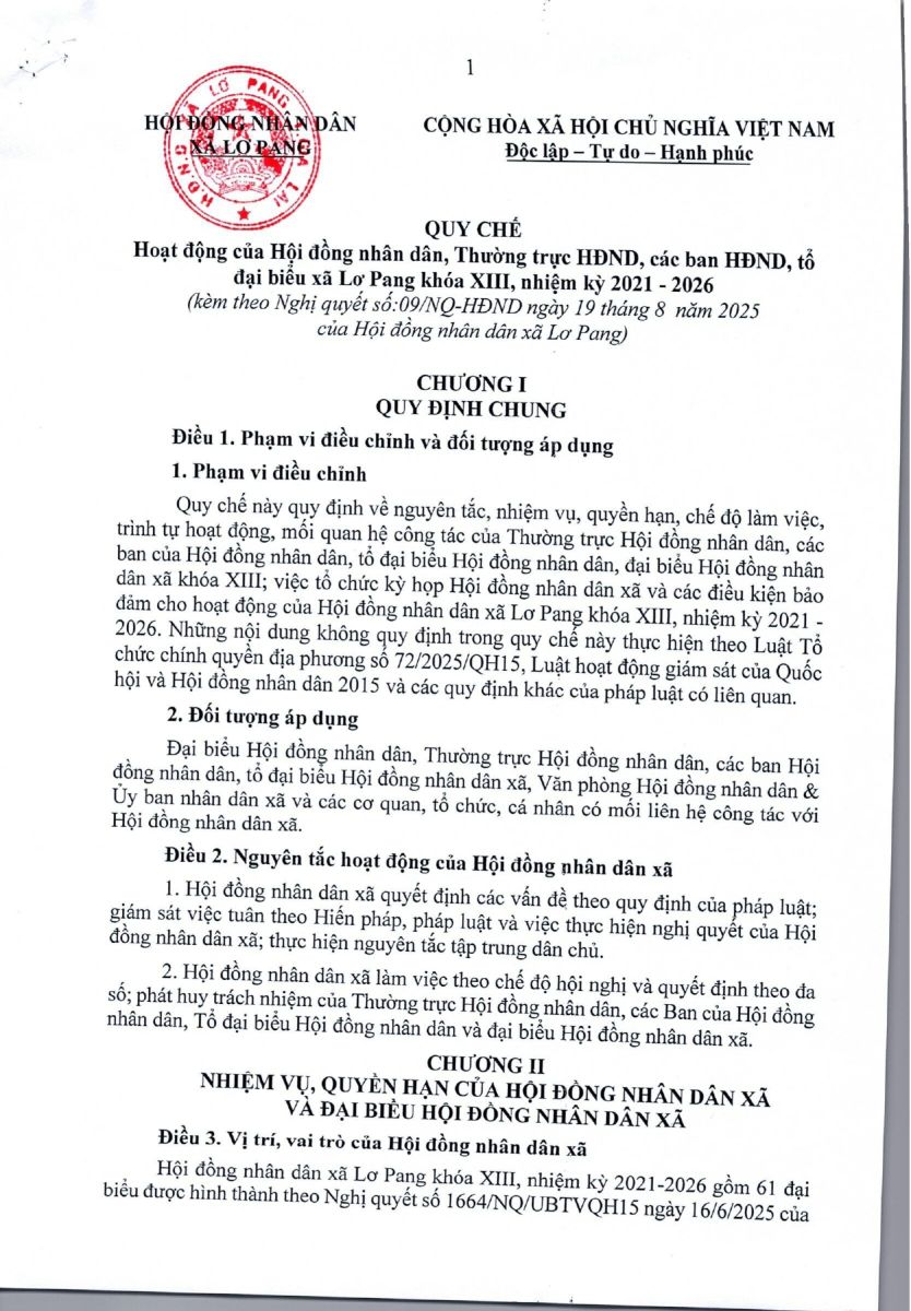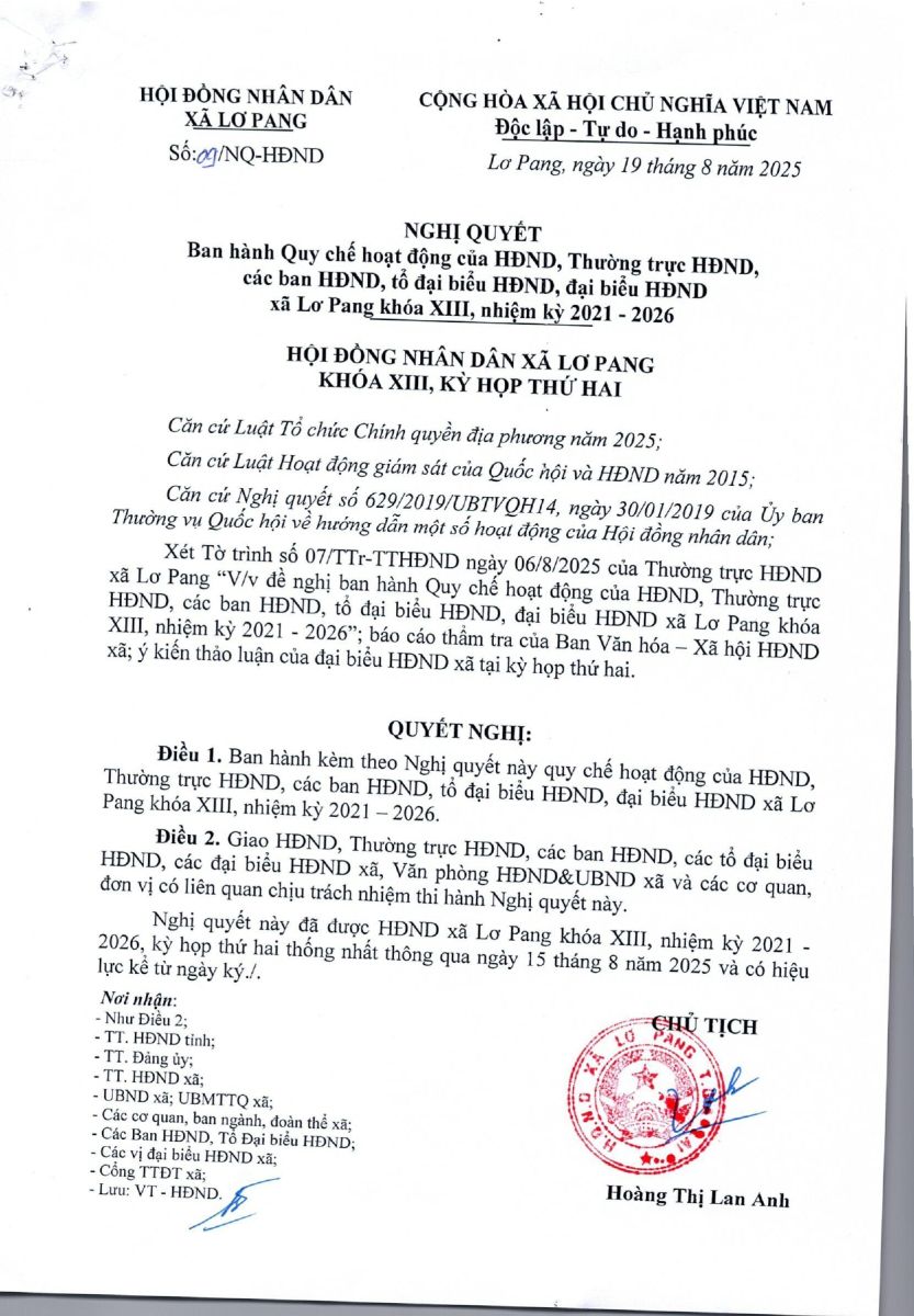 Nghị quyết số 09/NQ-HĐND ngày 19 tháng 8 năm 2025 của hội đồng nhân dân xã Lơ Pang về Ban hành Quy chế hoạt động của HĐND, Thường trực HĐND, các ban HĐND, tổ đại biểu HĐND, đại biểu HĐND xã Lơ Pang khóa XIII, nhiệm kỳ 2021 - 2026