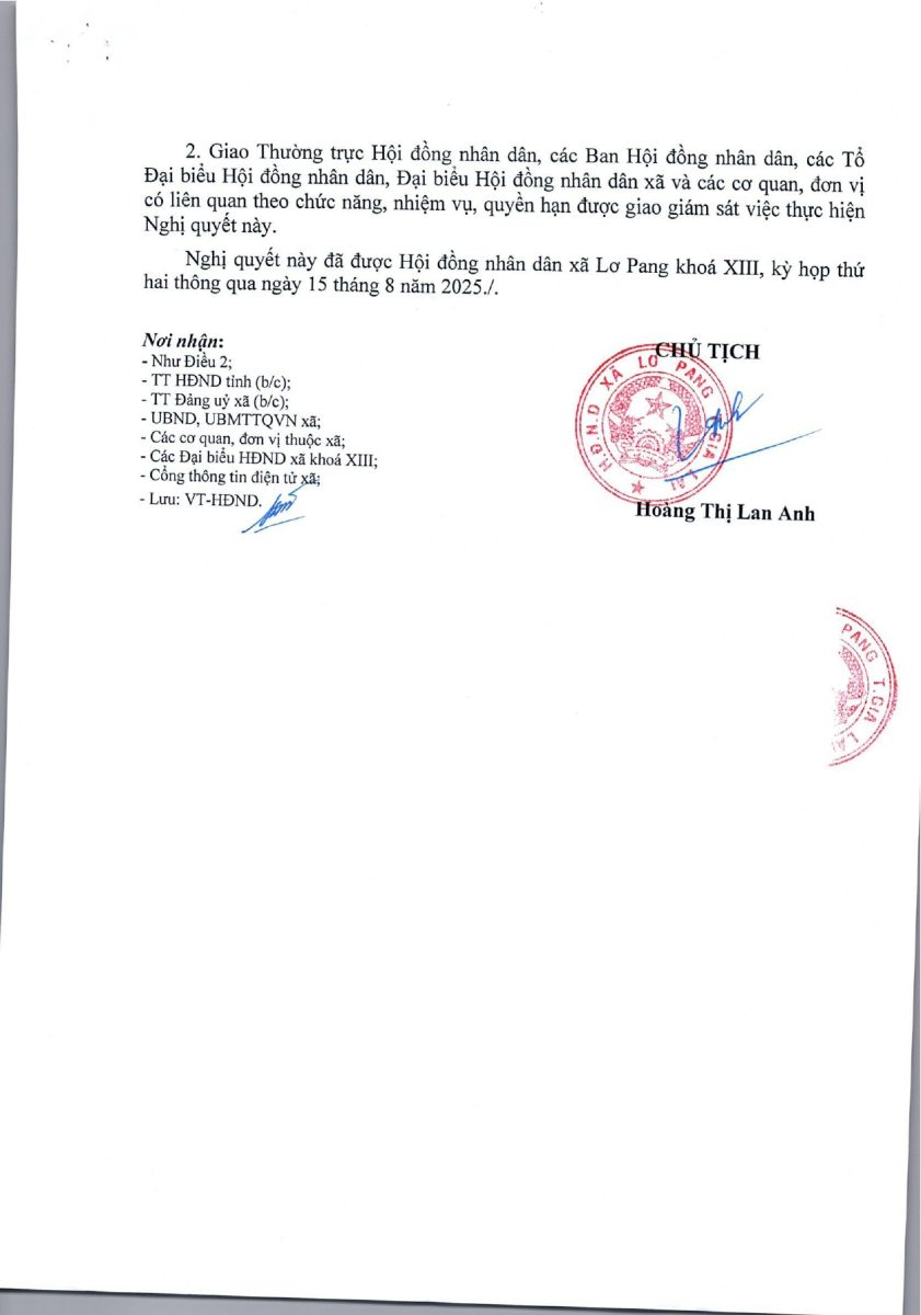 Nghị quyết số 04/NQ-TTHĐND ngày 24 tháng 7 năm 2025 của Hội đồng nhân dân xã Lơ Pang về việc thành lập tổ đại biểu HĐND xã và chỉ định Tổ trưởng, Tổ phó của Tổ đại biểu HĐND xã khóa XIII, nhiệm kỳ 2021-2026