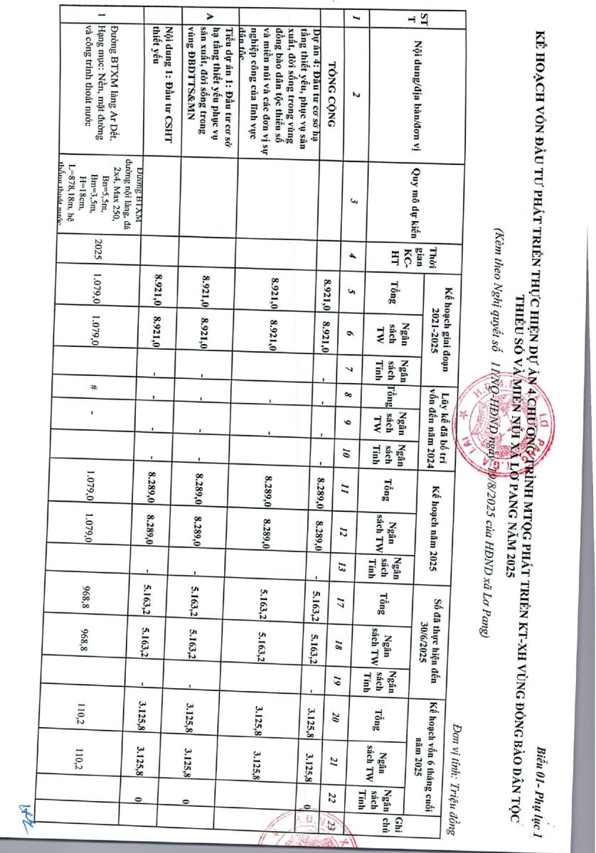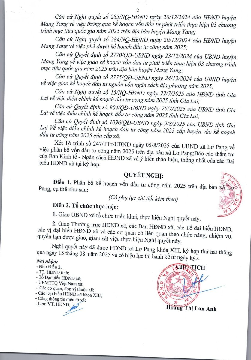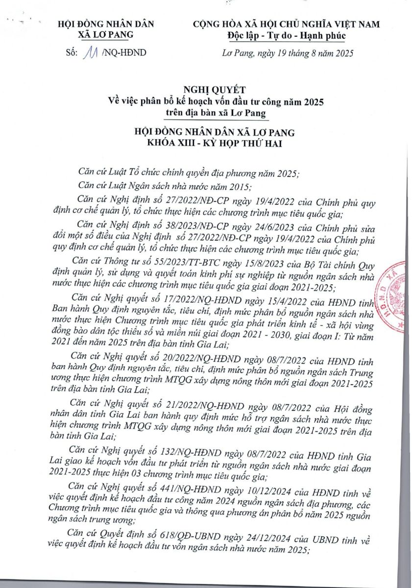 Thứ tư, 15/10/2025 | 09:42 A- A A+ | Nghị quyết số 11/NQ-HĐND ngày 19 tháng 8 năm 2025 của hội đồng nhân dân xã Lơ Pang về việc phân bổ kế hoạch vốn đầu tư công năm 2025 trên địa bàn xã Lơ Pang Chia sẻ Đọc bài Lưu