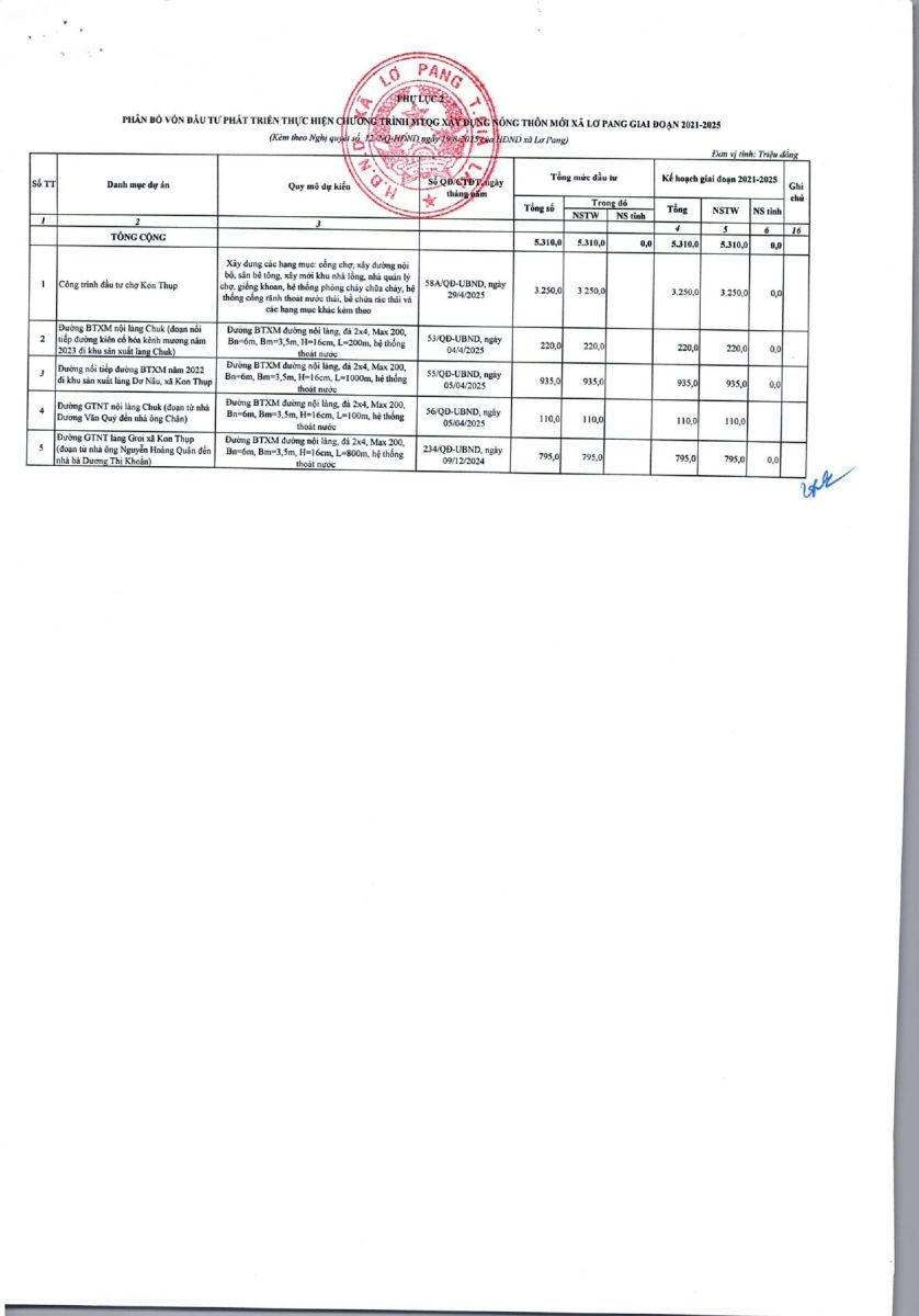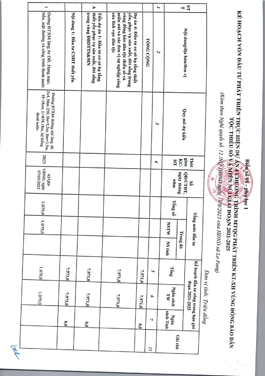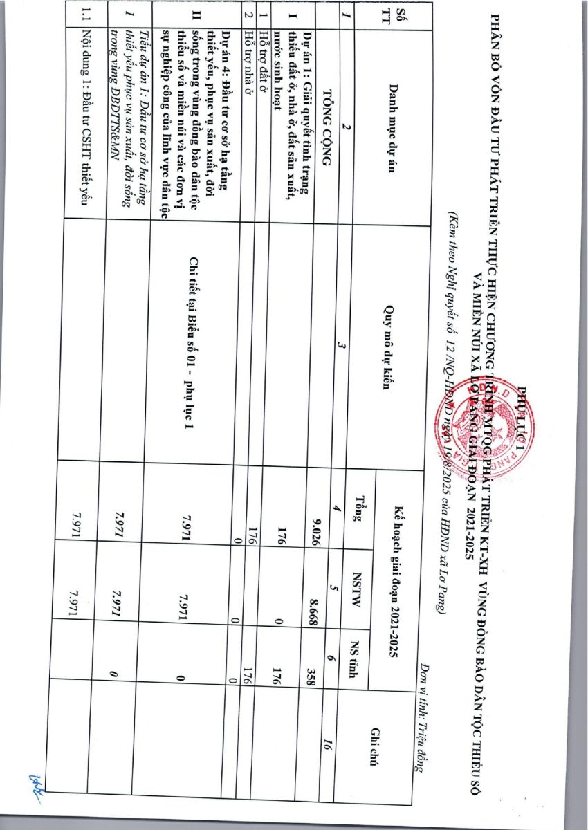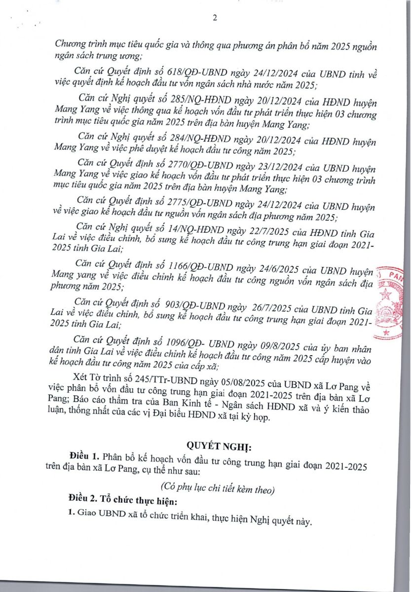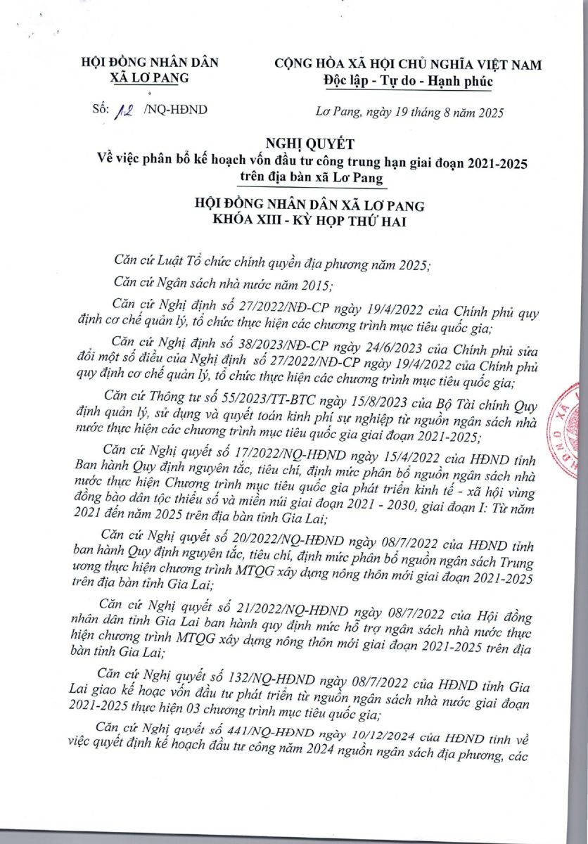 Thứ tư, 15/10/2025 | 09:47 A- A A+ | Nghị quyết số 12/NQ-HĐND ngày 19 tháng 8 năm 2025 của hội đồng nhân dân xã Lơ Pang về việc phân bổ kế hoạch vốn đầu tư công trung hạn giai đoạn 2021-2025 trên địa bàn xã Lơ Pang Chia sẻ Đọc bài Lưu