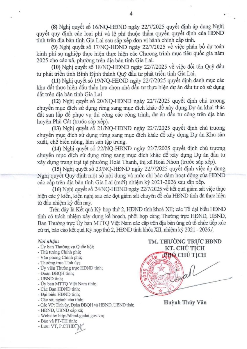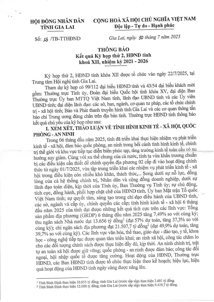 Thứ tư, 15/10/2025 | 13:53 A- A A+ | Thông báo số 15/TB-TTHĐND ngày 30 tháng 7 năm 2025 của hội đồng nhân dân tỉnh Gia lai về Kết quả Kỳ họp thứ 2, HĐND tỉnh khóa XII, nhiệm kỳ 2021 - 2026 Chia sẻ Đọc bài Lưu