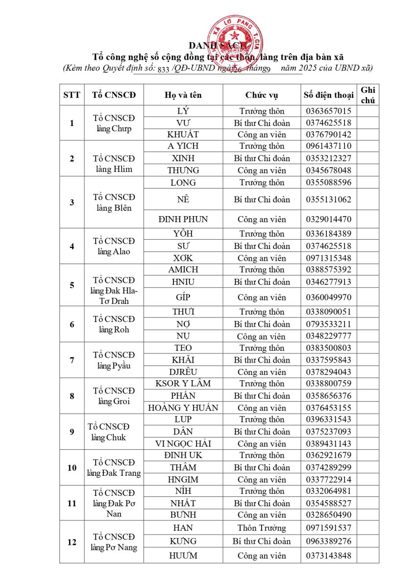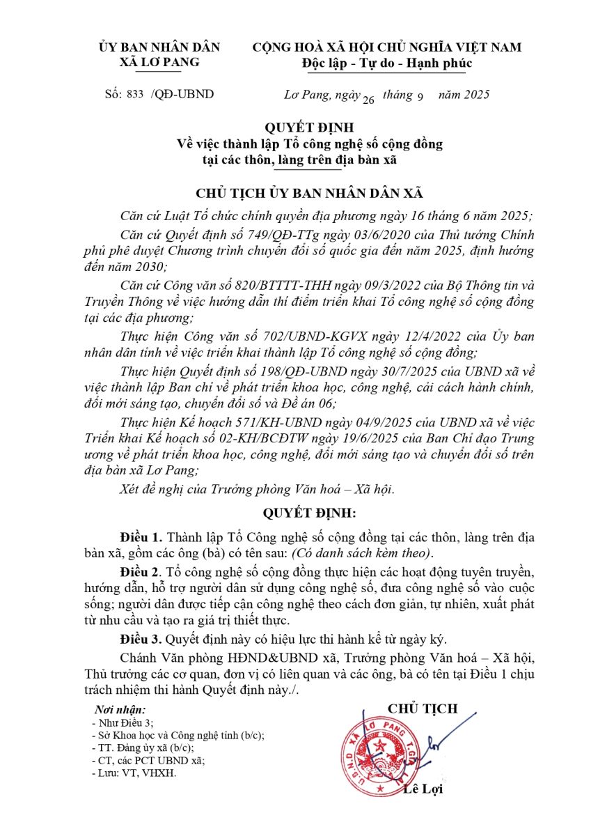 Thứ tư, 12/11/2025 | 09:58 A- A A+ | Quyết định số 833/QĐ-UBND ngày 26 tháng 9 năm 2025 của UBND xã Lơ Pang Về việc thành lập Tổ công nghệ số cộng đồng tại các thôn, làng trên địa bàn xã Chia sẻ Đọc bài Lưu