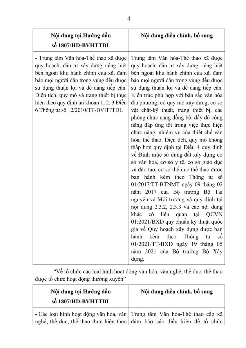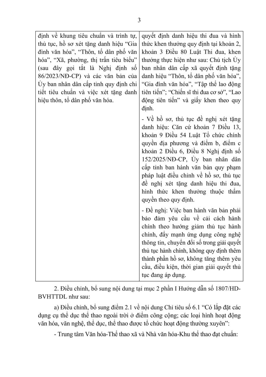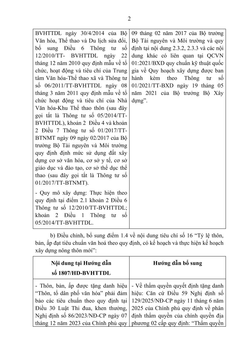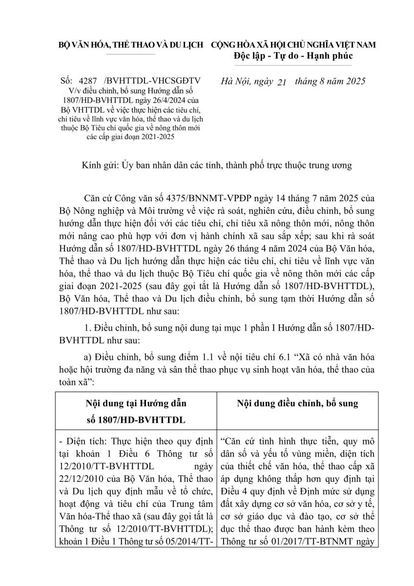 Công văn số 4287/BVHTTDL-VHCSGĐTV ngày 21/8/2025 của Bộ Văn hóa, Thể thao và Du lịch về việc điều chỉnh, bổ sung Hướng dẫn số 1807/HD-BVHTTDL ngày 26/4/2024 của Bộ VHTTDL về việc thực hiện các tiêu chí, chỉ tiêu về lĩnh vực văn hóa, thể thao và du lịch thuộc Bộ Tiêu chí quốc gia về nông thôn mới các cấp giai đoạn 2021-2025