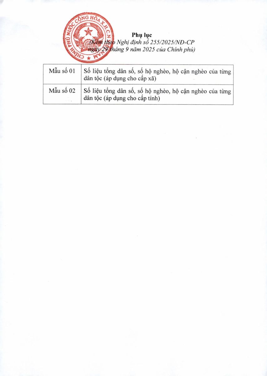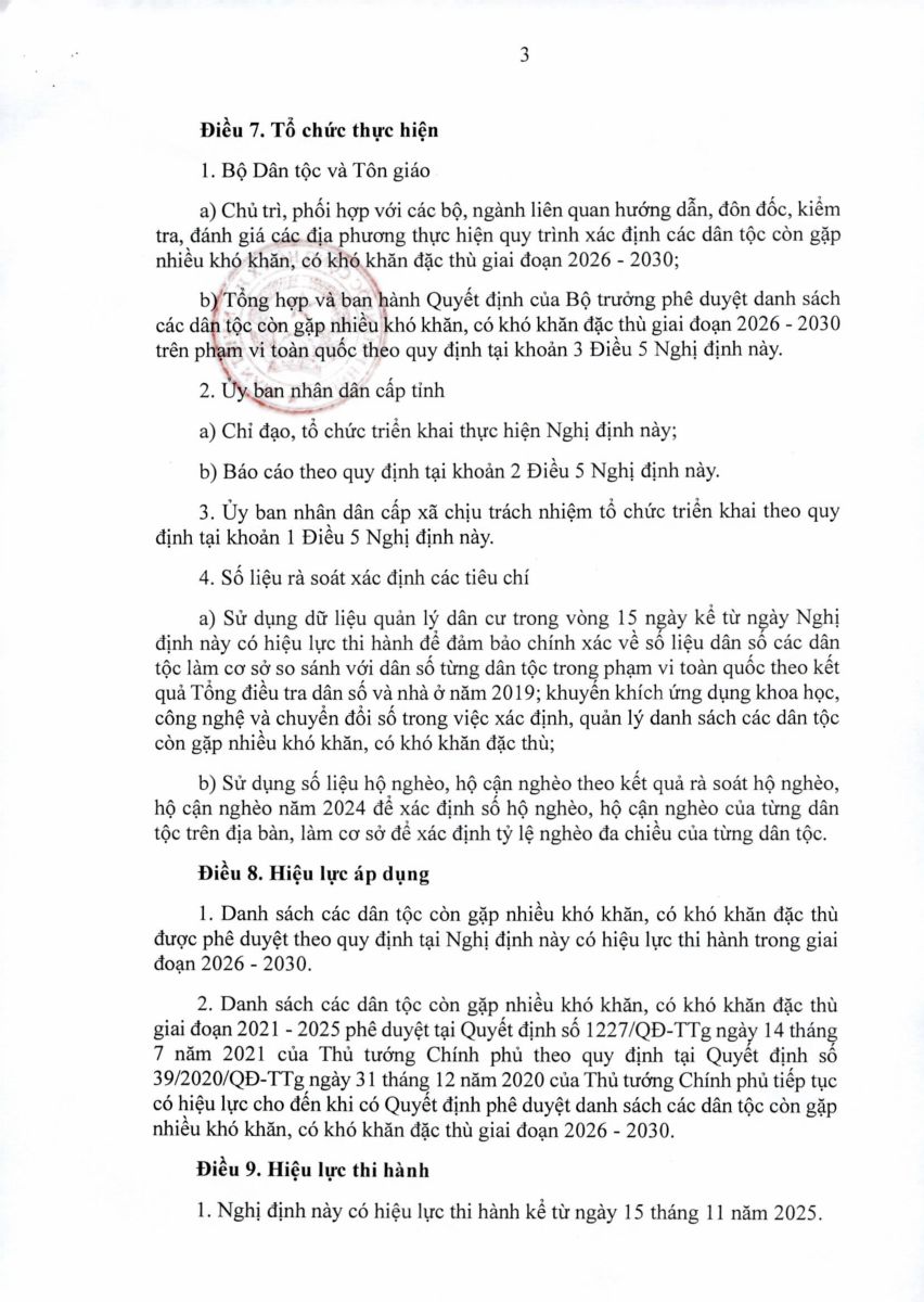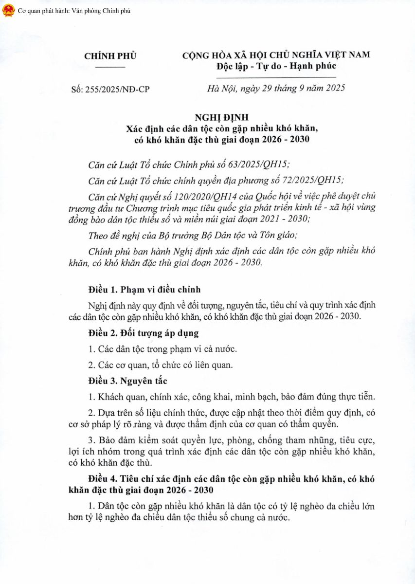 Nghị định số 255/2025/NĐ-CP ngày 29 tháng 9 năm 2025 của Văn phòng chính phủ về việc Xác định các dân tộc còn gặp nhiều khó khăn, có khó khăn đặc thù giai đoạn 2026 - 2030