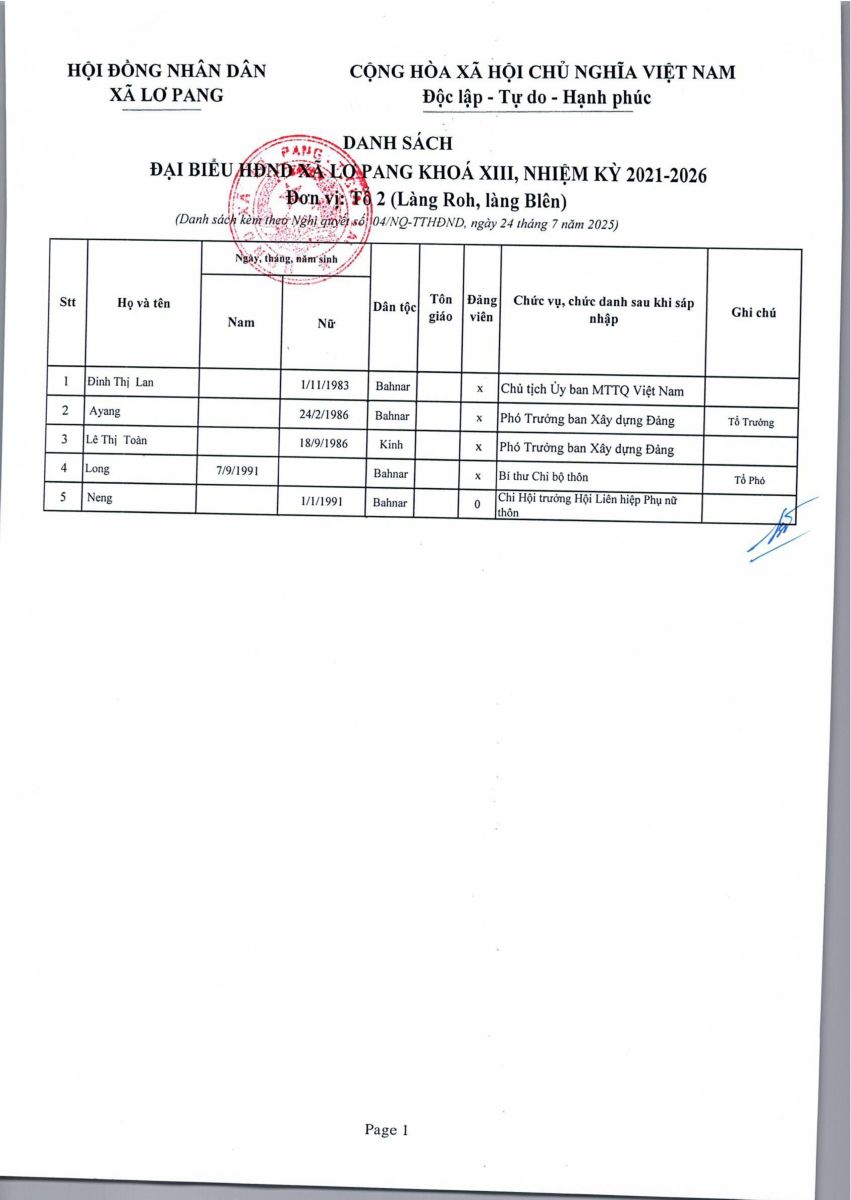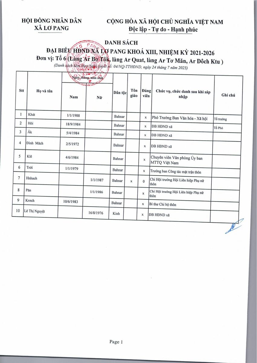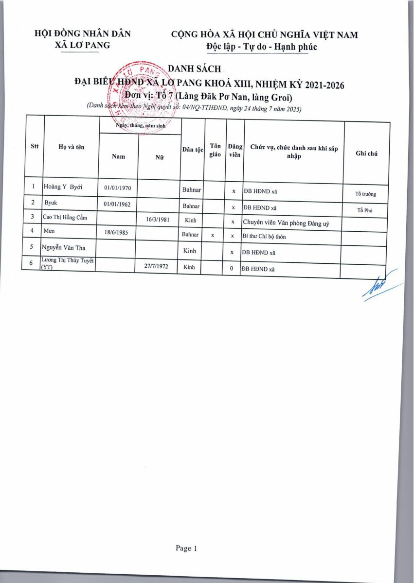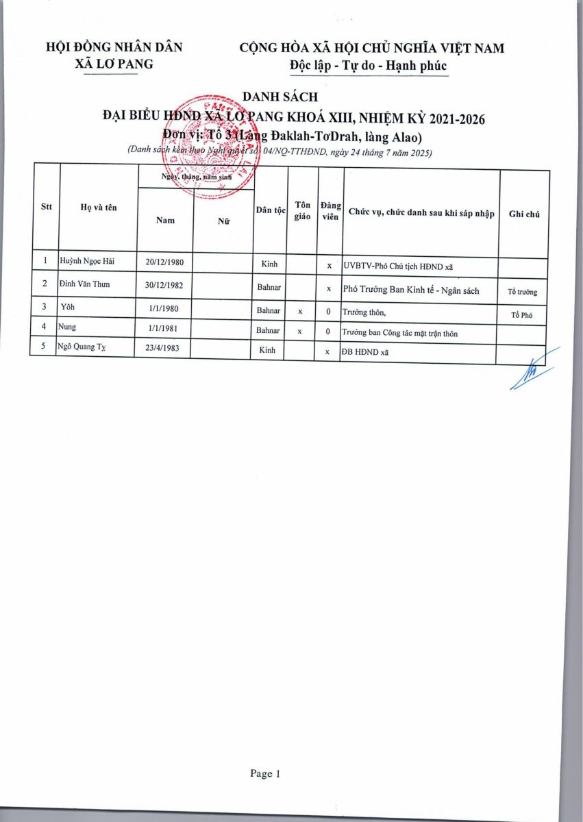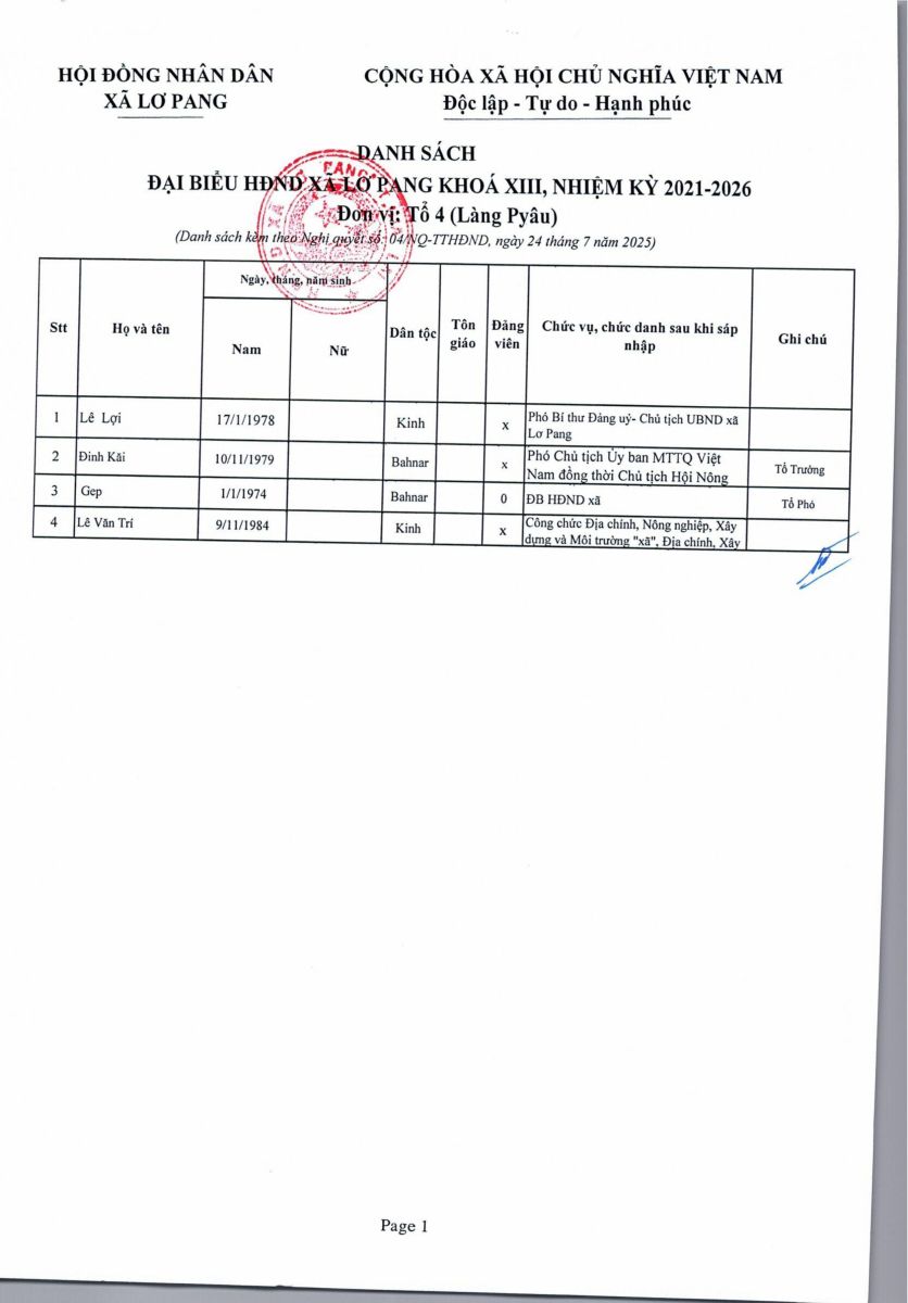 Nghị quyết số 04/NQ-TTHĐND ngày 24 tháng 7 năm 2025 của Hội đồng nhân dân xã Lơ Pang về việc thành lập tổ đại biểu HĐND xã và chỉ định Tổ trưởng, Tổ phó của Tổ đại biểu HĐND xã khóa XIII, nhiệm kỳ 2021-2026