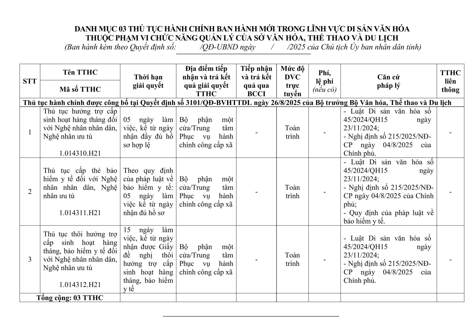 Quyết định số 1671/QĐ-UBND ngày 04/09/2025 về Công bố Danh mục thủ tục hành chính ban hành mới trong lĩnh vực Di sản văn hóa thuộc phạm vi chức năng quản lý của Sở Văn hóa, Thể thao và Du lịch