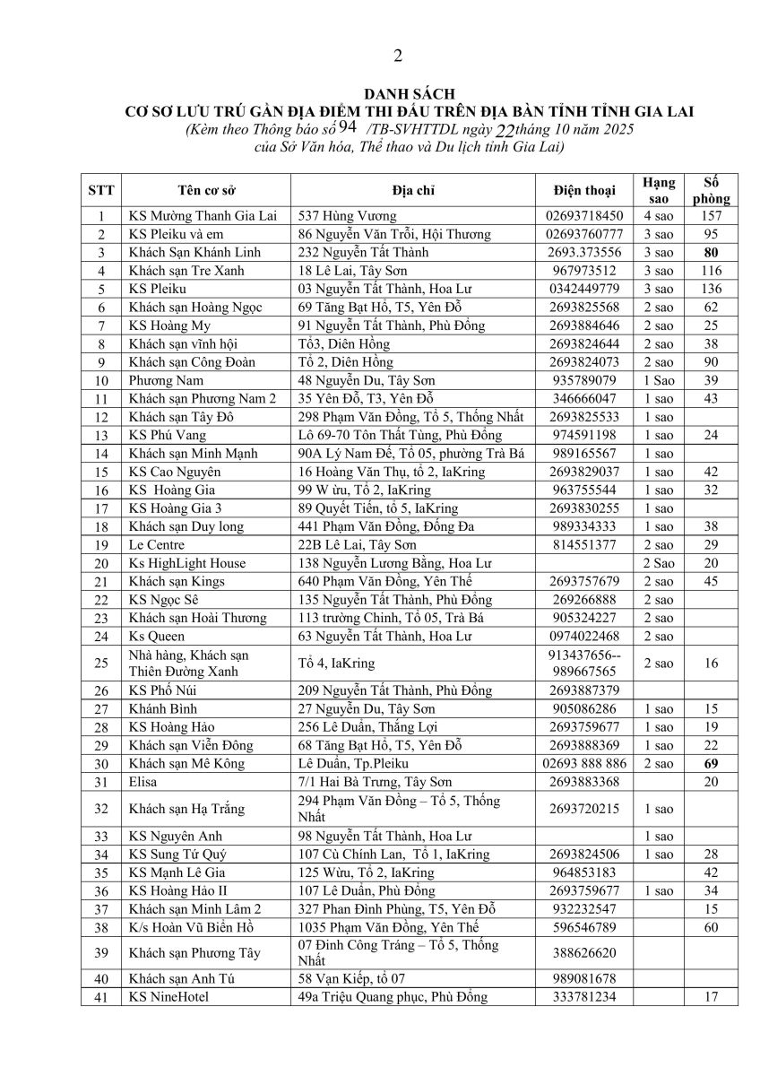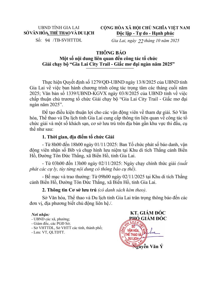 Thông báo số 94/TB-SVHTTDL ngày 22 tháng 10 năm 2025 của Sở văn hóa, Thể thao và Du lịch tỉnh Gia Lai về Một số nội dung liên quan đến công tác tổ chức Giải chạy bộ "Gia Lai City Trail - Giấc mơ đại ngàn năm 2025"