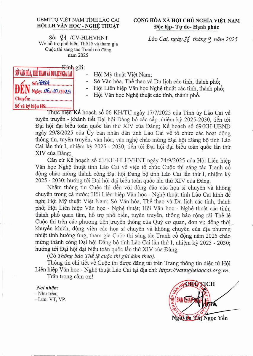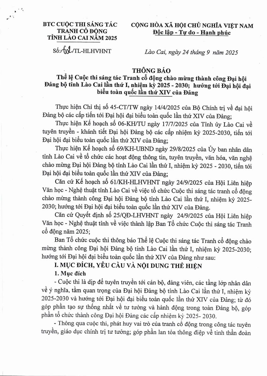 Thứ hai, 20/10/2025 | 09:12 A- A A+ | Thông báo thể lệ cuộc thi Sáng tác tranh cổ động năm 2025 Chia sẻ Đọc bài Lưu